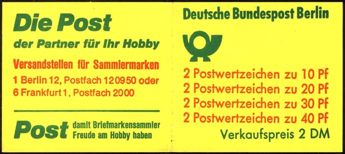 | In unserer Berlin-Markenheftchen-Liste finden Sie MH von 1 bis 15, unterteilt in eine Normal- und eine Spezialeinteilung, unterschieden nach Randleistenvarianten. |